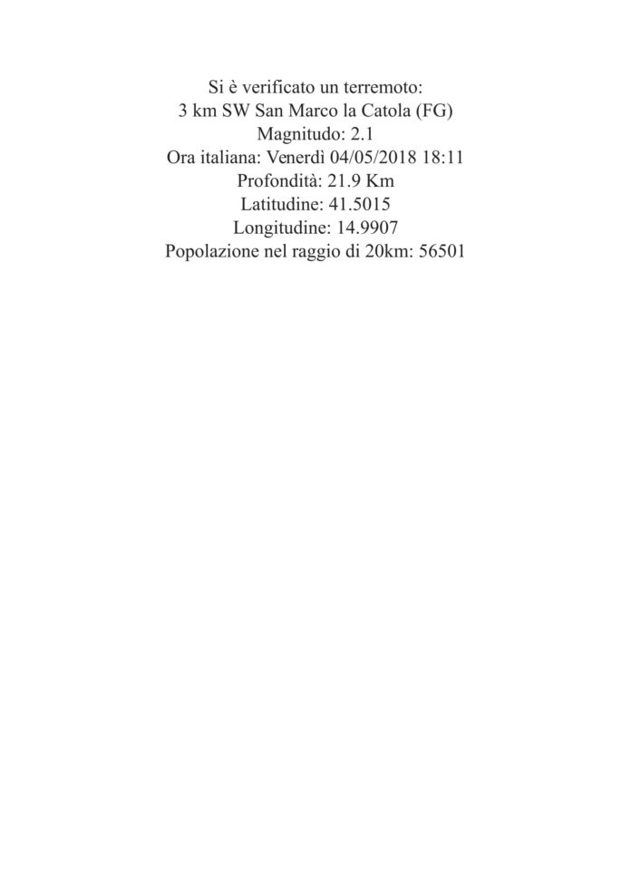 Un terremoto di magnitudine 2.1 sulla scala Richter, avvenuto alle 18, 11 minuti e 19 secondi di oggi venerdì 4 maggio e registrato ad una profondità di 22 km, come segnala l’INGV, ha interessato la provincia di Foggia in Puglia.