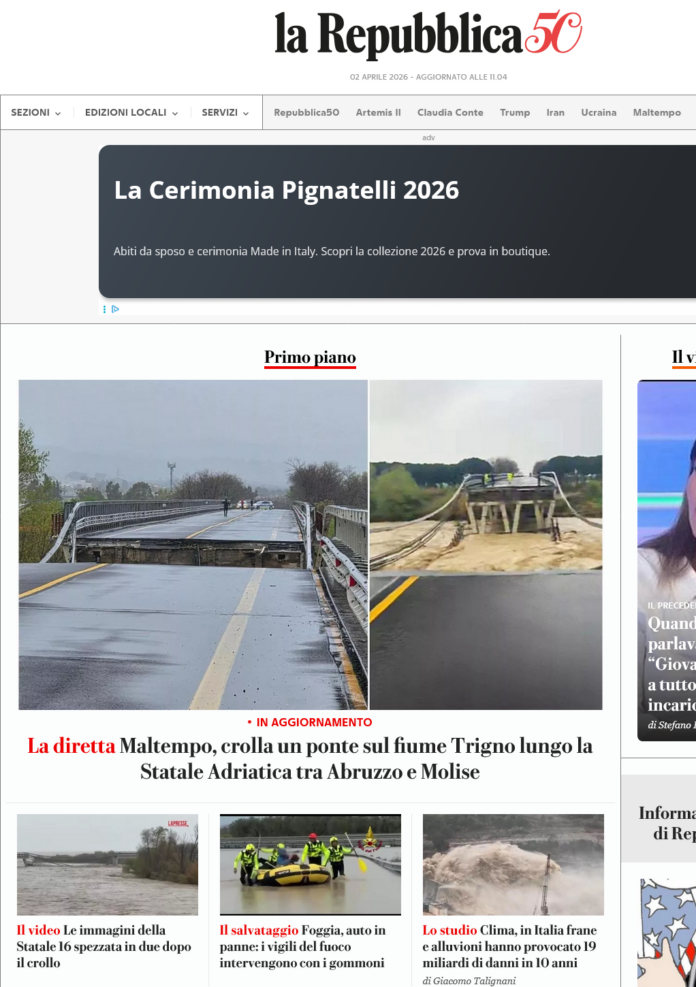 Sulla versione cartacea del maggior quotidiano d’Italia il Corriere della Sera, ad oggi 2 aprile 2026 del ciclone “Erminio” non c’è traccia.